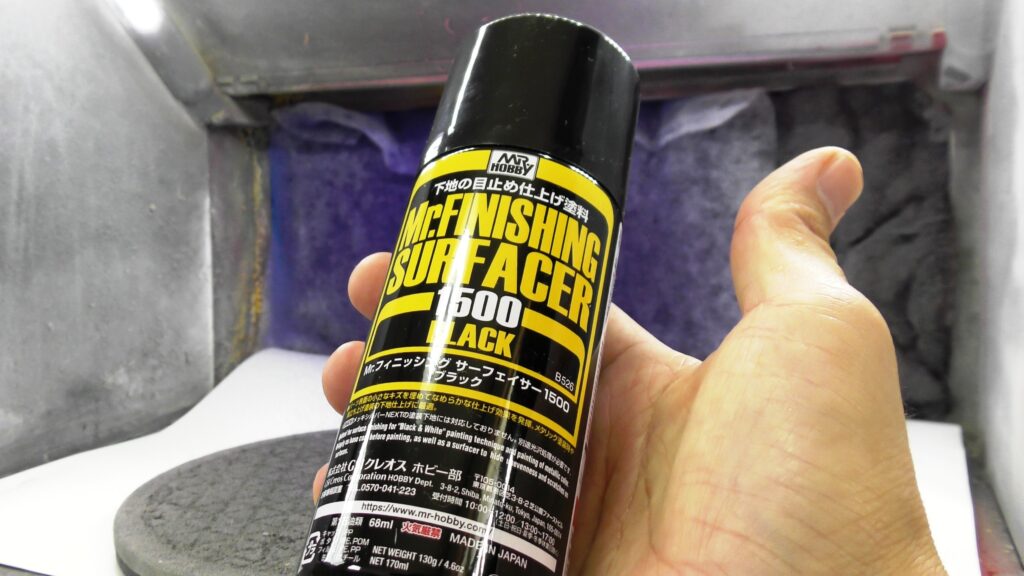 まずは下地塗装に「Mr.フィニッシングサーフェイサー1500ブラック」を吹きます!